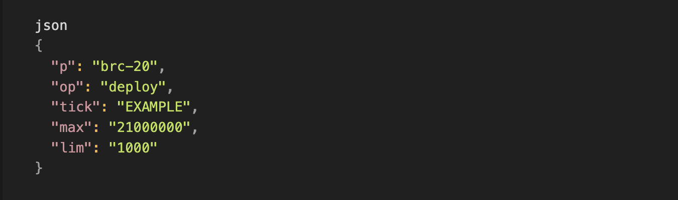 A simple example of a BRC-20 deployment inscription might look like this (in JSON format):